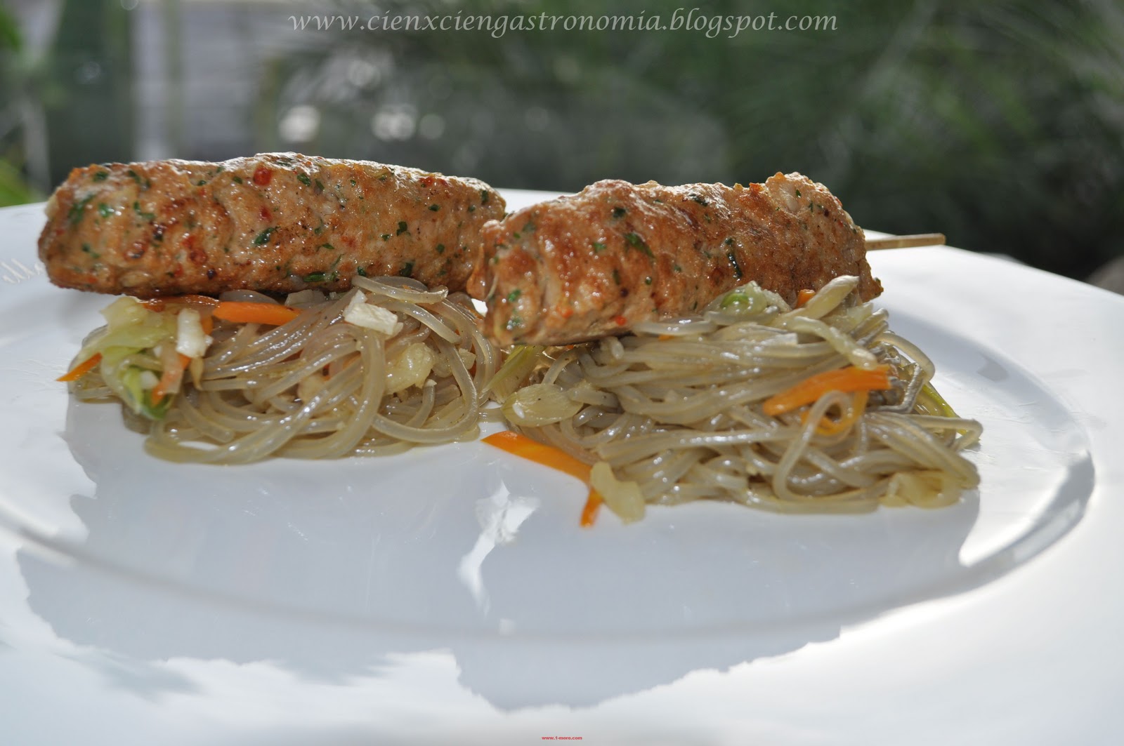 Este es un plato muy socorrido, nos vale perfectamente como entrante sirviendo sólo una brocheta con un poco de fideos o si lo preferimos como plato único podemos servir 2 o 3 con una buena ración de fideos. Además de muy muy sencillo se ajusta a todos los bolsillos, y si rebajamos un poco la cantidad de cúrcuma y chili les gustará hasta a los niños.